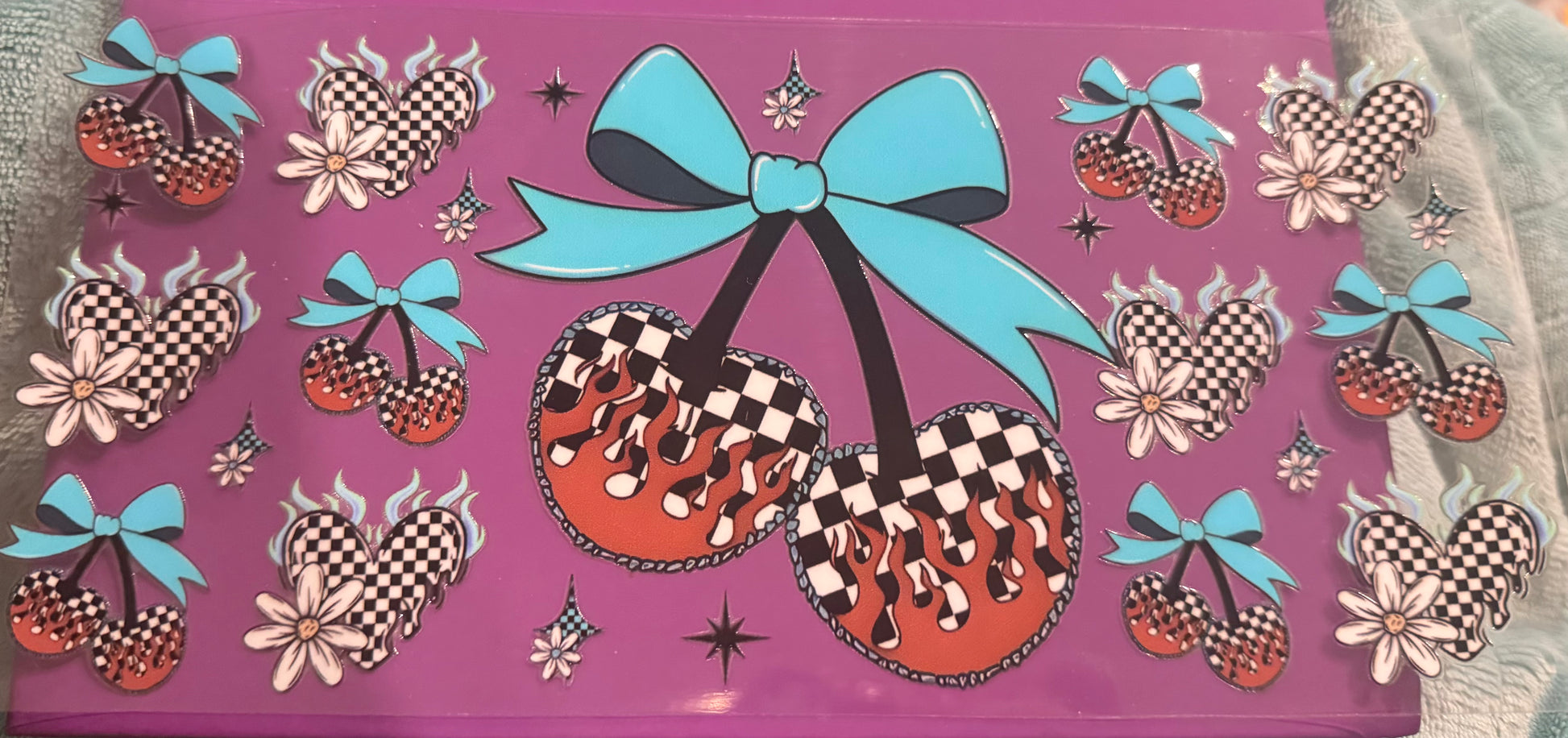Teal checkered, cherry bow